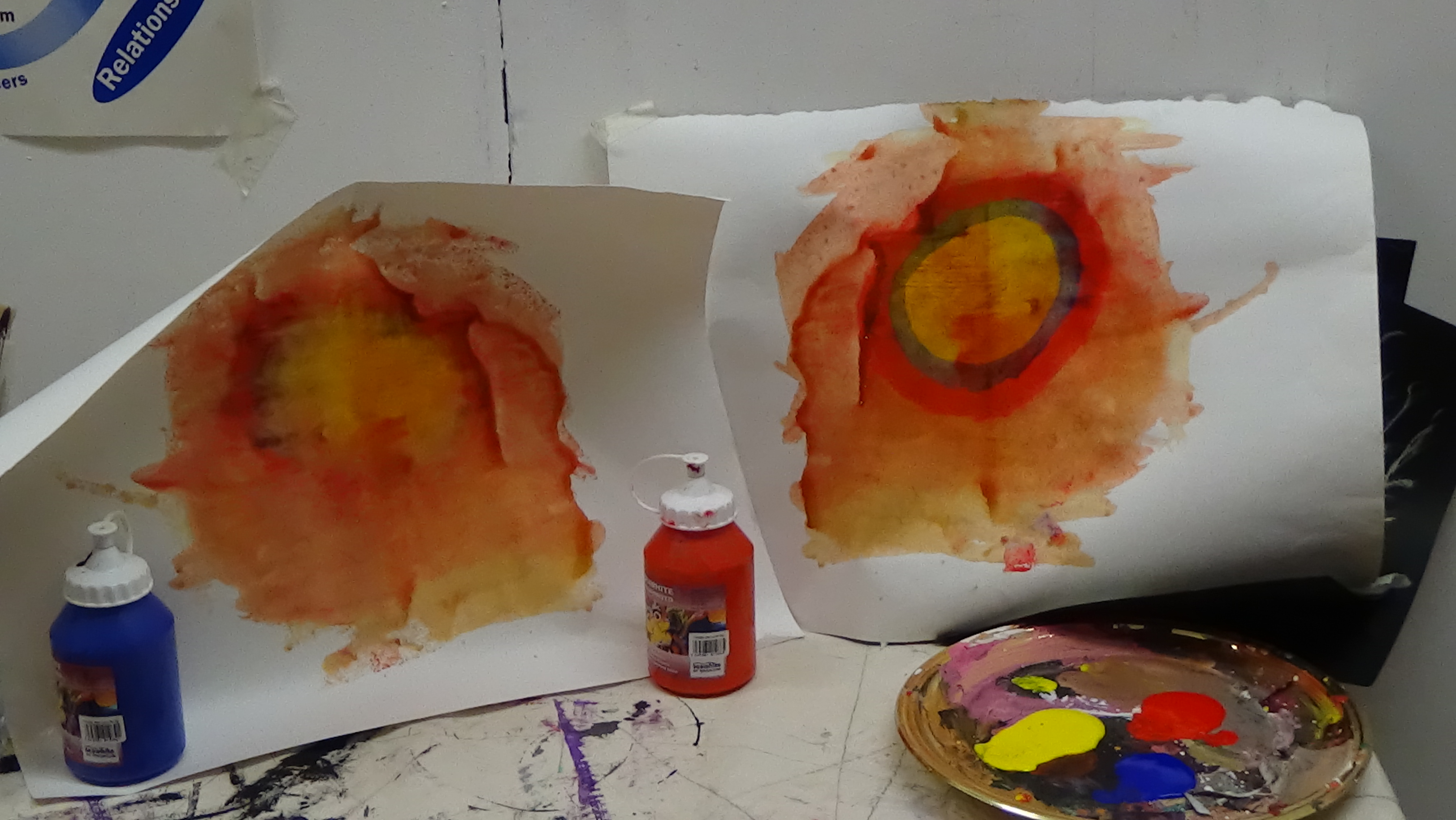 I was quite amazed at what came out. I did a central circle of yellow and then a ring of blue then one of red. Then I decided it was too stark and I used water to soften it (image on the right). Then I took a mirror print by putting a fresh sheet of paper on top of the wet original and ended with a much softer pleasing “ghost” of my original (image on left). It was very important for me that water was used to soften things. It was all too stark otherwise. I do know that I am much better by the sea and near water (I live next to a river and have a place by the sea I go to every week). My last remedy is > by the sea. So something of me is coming out in the picture. I was very pleased with the final print. Everyone made comments about each art work as it emerged and there were different interpretations of mine. All agreed however that the ghost print was an interesting outcome.